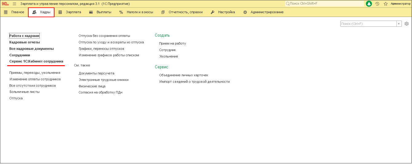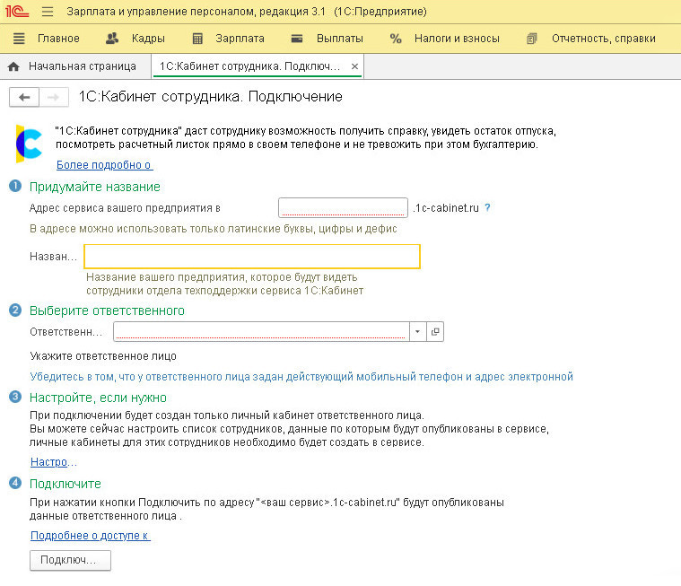 Обратите внимание: чтобы работать с сервисом 1С Кабинет сотрудника, необходимо подключить интернет-поддержку пользователей.