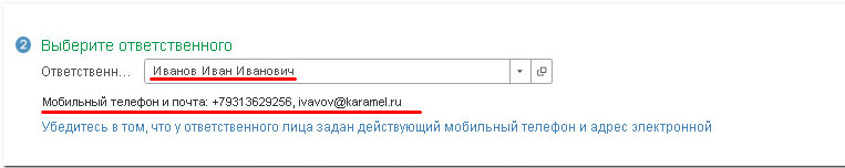 Убедитесь, что в карточке у ответственного сотрудника указан актуальный адрес электронной почты и номер мобильного телефона.