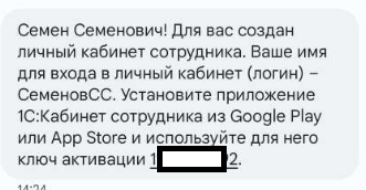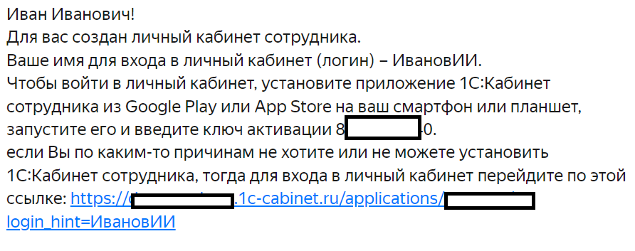 Авторизация в 1С Кабинет сотрудника или вход происходит по личному логину и паролю. По электронной почте или в СМС-сообщении вам придет приглашение в личный кабинет. Пример текста приглашения по email: