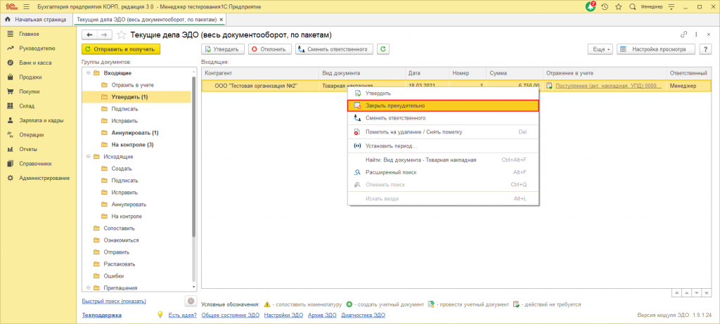 Консультация специалиста 1СВ отдельных ситуациях при работе с сервисом 1С-ЭДО может возникнуть необходимость досрочно завершить электронный документооборот по входящим или исходящим документам. Для таких случаев в системе предусмотрен механизм Принудительное закрытие электронного документа. С его помощью пользователь может корректно завершить обмен, если стандартным способом это сделать невозможно.