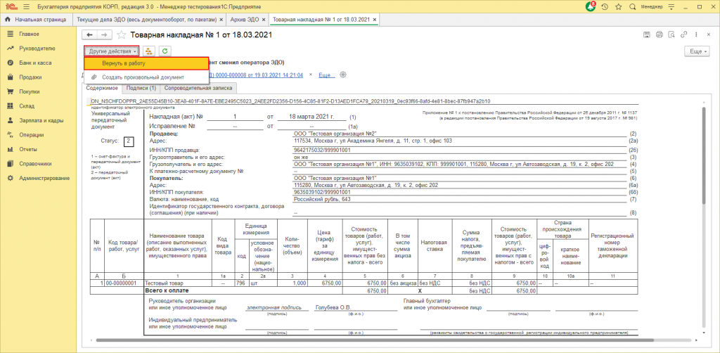 Начиная с версии модуля ЭДО 1.9.1, в 1С появилась возможность вернуть ранее закрытый документ в работу. Для этого: