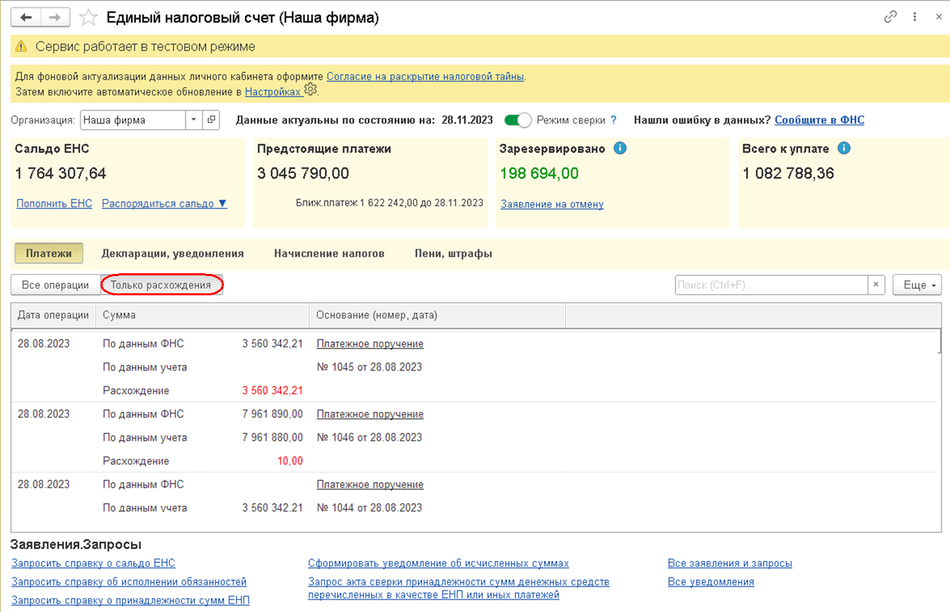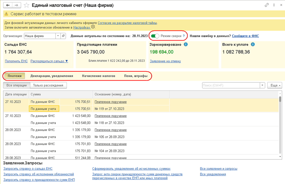 Интеграция с личным кабинетом ФНС предусмотрена на всех основных тарифах сервиса 1С-Отчетность. Пользуйтесь всеми преимуществами решения: контролируйте ЕНС и сальдо в режиме «одного окна», анализируйте операции с детальной расшифровкой по ЕНС, планируйте платежи на основании информации ФНС.