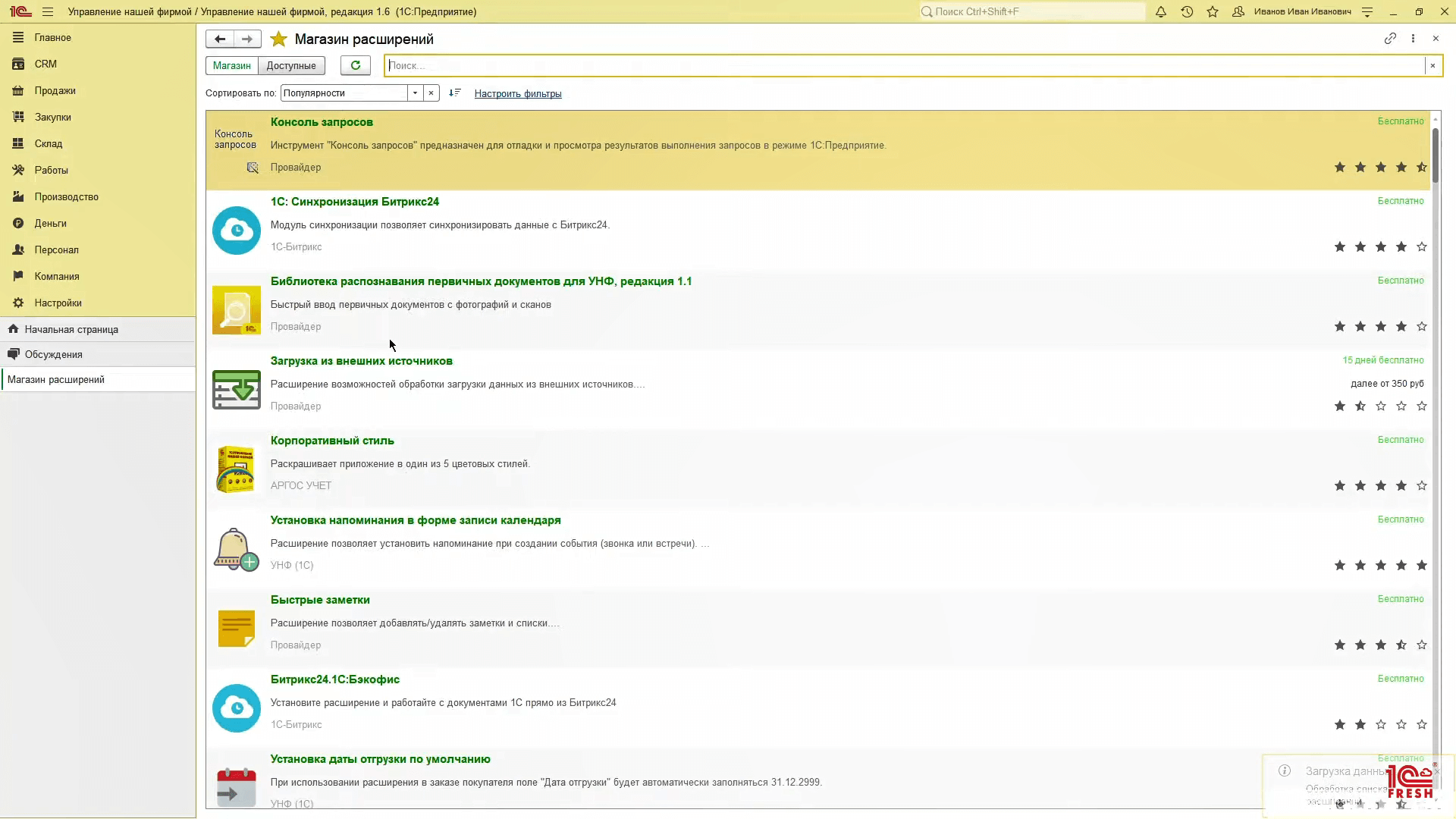 Рассмотрим на примере бесплатного сервиса, как проходит установка расширения в 1С Фреш.