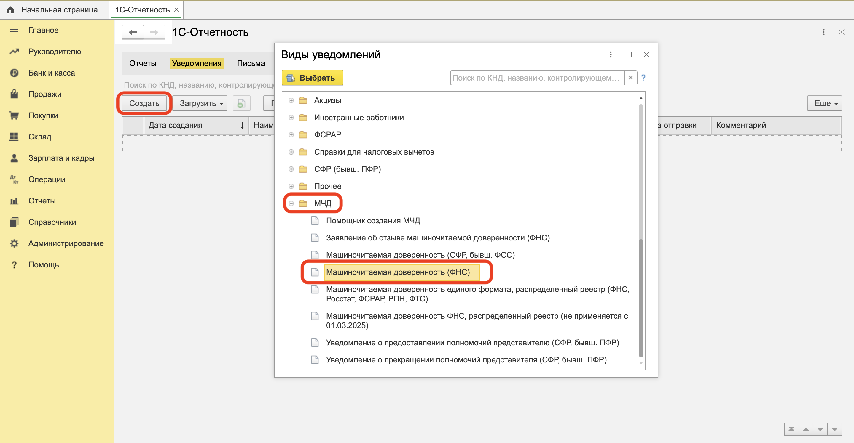В программе «1С:Бухгалтерия» перейдите в раздел Отчеты. В подразделе 1С-Отчетность выберите Уведомления, сообщения и заявления.